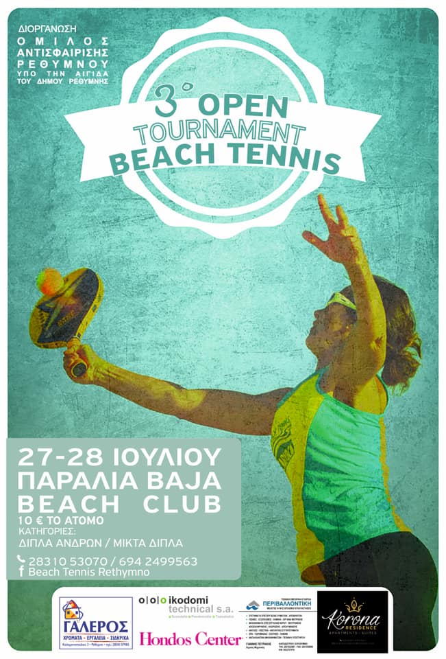 Για άλλη μια χρονιά, ο Όμιλος Αντισφαίρισης Ρεθύμνου στα πλαίσια των καλοκαιρινών δραστηριοτήτων του διοργανώνει open τουρνουά beach tennis, το 3ο κατά σειρά!